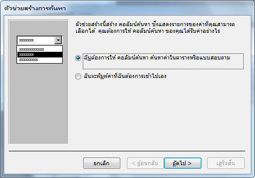 อันแรกคือเราจะเลือกตัวเลือกจากตารางหรือแบบสอบถาม ส่วนอันที่สองคือ เราจะพิมพ์ตัวเลือกเอง ให้เราเลือกอันแรก แล้วคลิกที่ปุ่มถัดไปครับ
